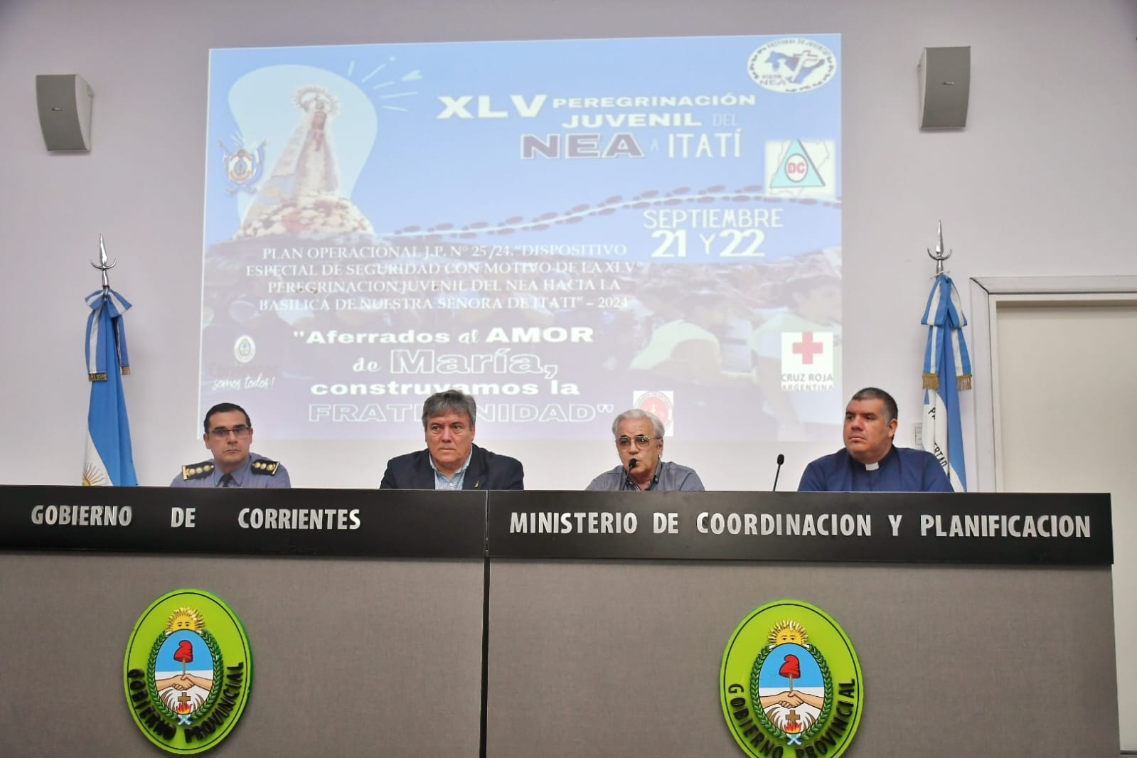 El encuentro tuvo lugar en el Salón de Usos Múltiples del ministerio de Coordinación y Planificación (25 de Mayo 1041) con la presencia del subsecretario de Seguridad, comisario general (R), Osvaldo de los Santos García; el director de Defensa Civil, Eulogio Márquez; el director General de Seguridad Vial, comisario general Eduardo Dip; y el padre Germán Rodríguez, de la Arquidiócesis de Corrientes; quienes a través de una conferencia, presentaron detalles del operativo de esta nueva peregrinación que tiene por lema “Aferrados al amor de María, construyamos la fraternidad”