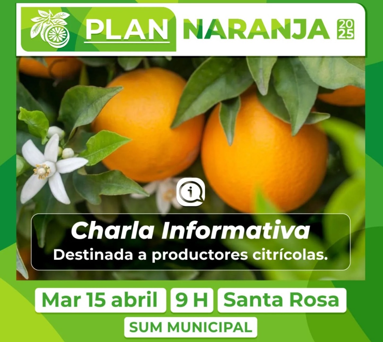 En paralelo, el martes 15 de abril a las 9, se realizará una reunión informativa en el SUM Municipal para presentar el Plan Naranja, un programa provincial destinado a productores que ya cuenten con plantaciones de cítricos. La iniciativa busca facilitar: